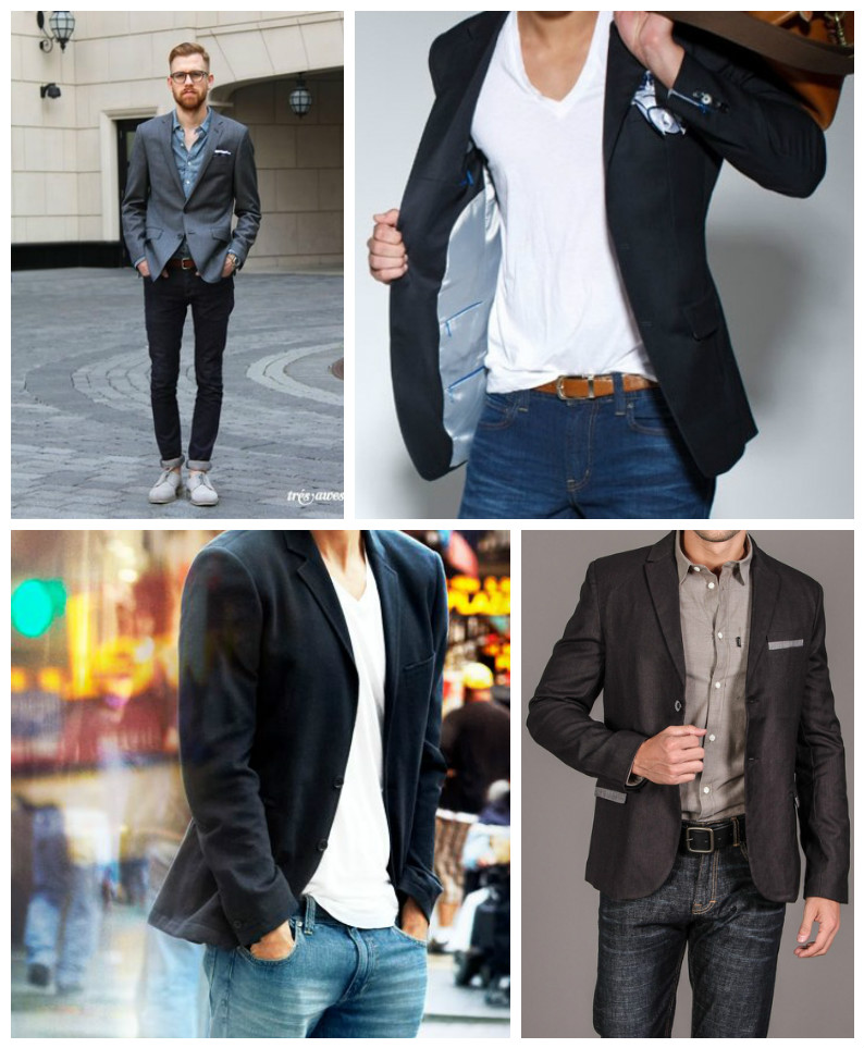 Візьміть піджак від костюму і використовуйте його як блейзер, поєднавши з футболкою та джинсами. Для більш святкового вигляду замініть футболку сорочкою, кеди – лакованою парою туфель та додайте краватку. Завдяки аксесуарам, образ легко перетворюється на більш офіційний або більш кежуал. Під піджак також можна надіти гольф або светр із сорочкою.