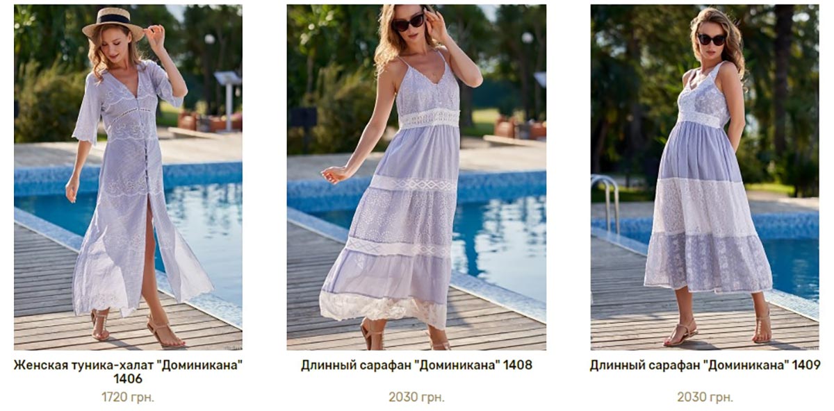 Модели пляжной одежды очень разнообразны. Так, итальянская марка Mia-Mia предлагает сарафаны и пляжные платья различной длины. Например, рубашка-туника "Доминикана" из тонкого хлопка в модную полоску сшитая в широком размерном ряде (42 (XS) - 54 (XXXL)), порадует поклонниц минимализма. Летом особенно популярен белый цвет, поэтому многие оценят комфорт и нежность сарафана "Аргентина" с кружевными вставками.